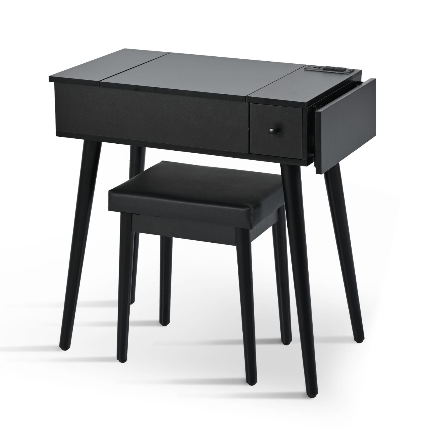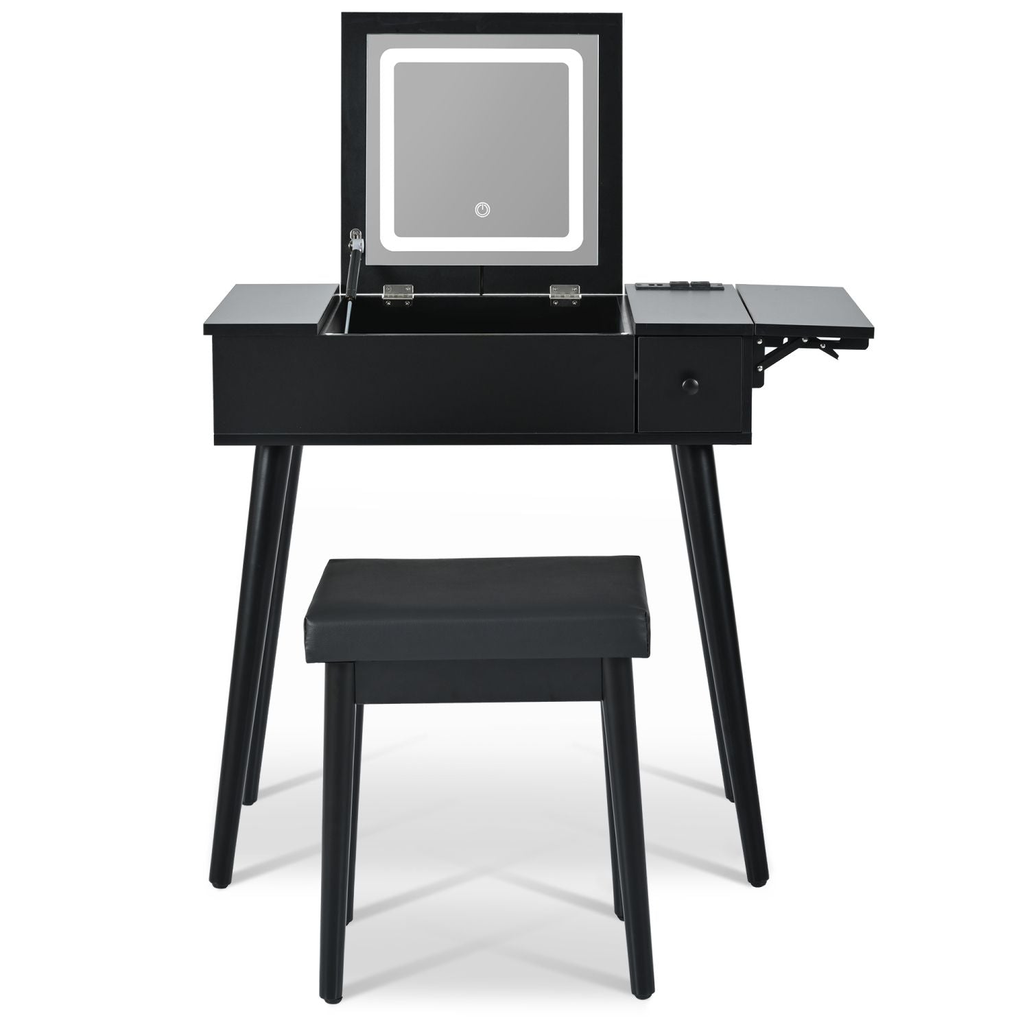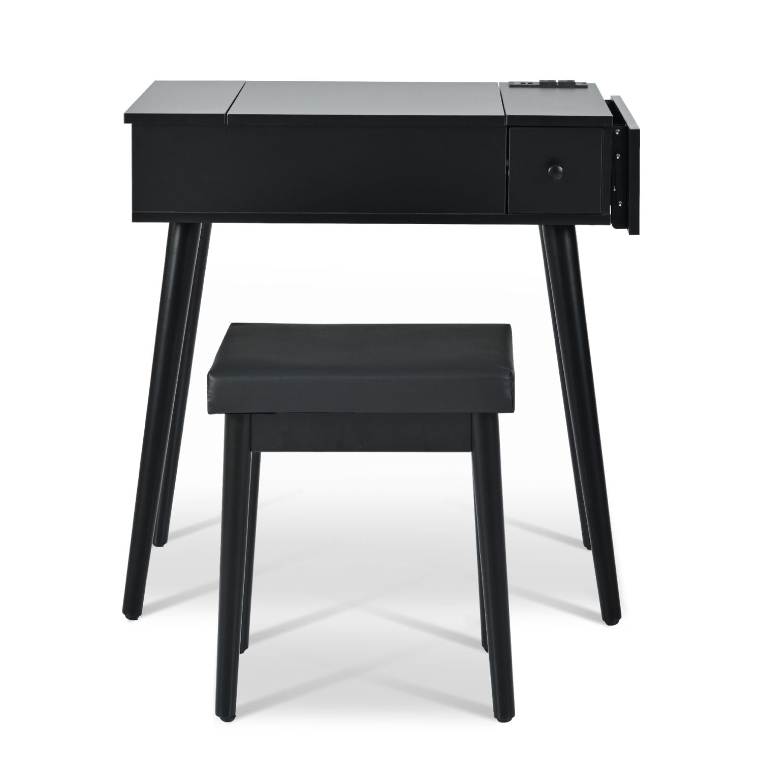 27.9'' Black Makeup Vanity Desk with Flip Top Mirror and LED Light, Dressing Table with Charging Station, 2 Drawers and Fold-up Panel, Vanity Set with Cushioned Stool for Bedroom
