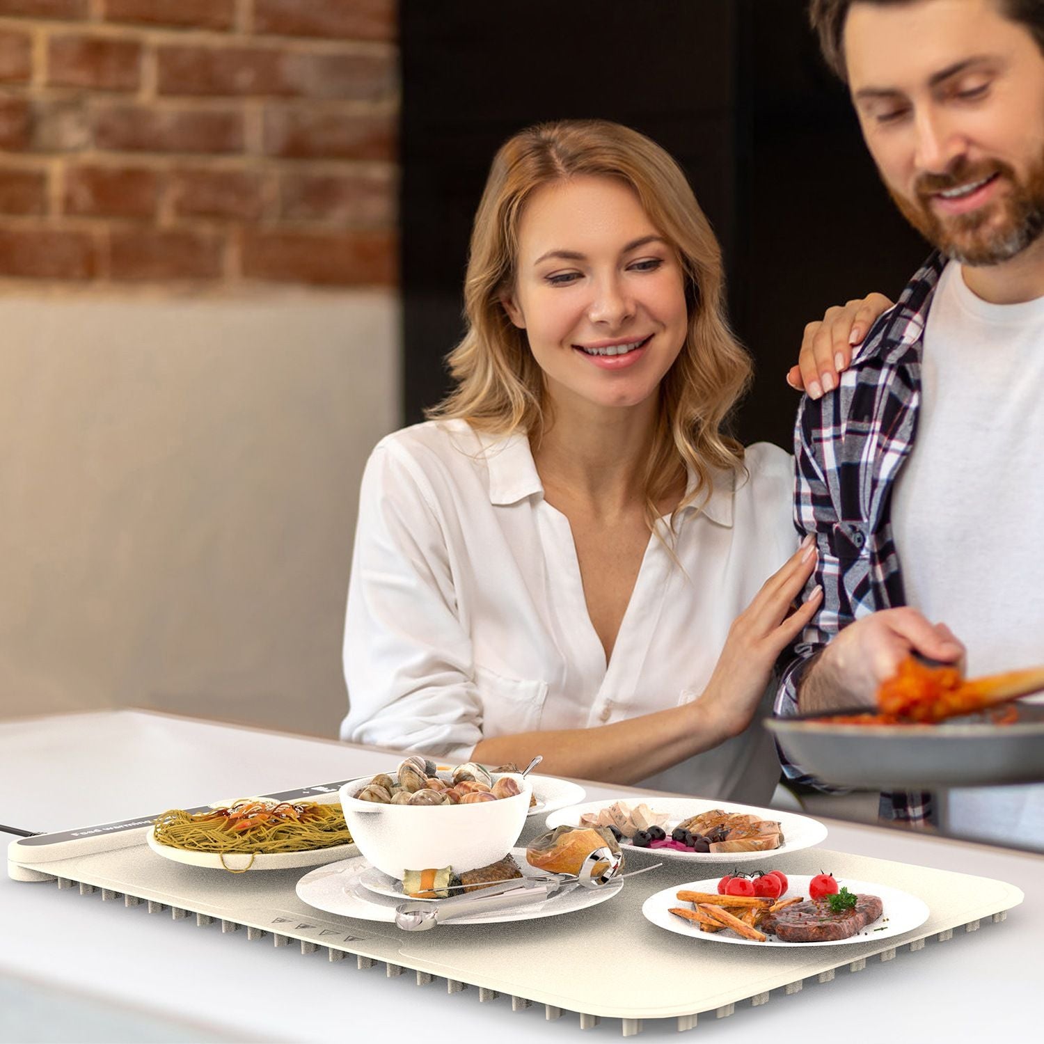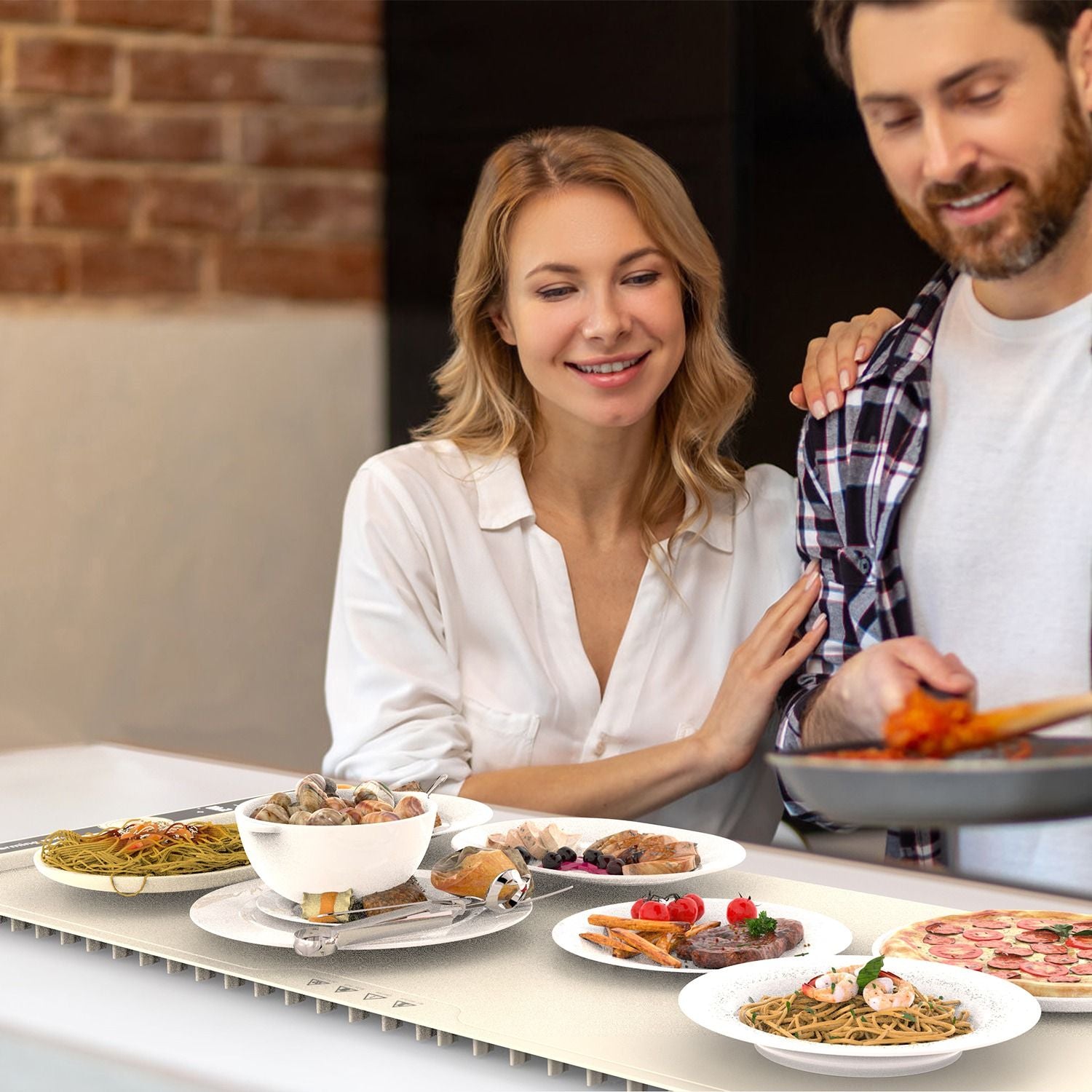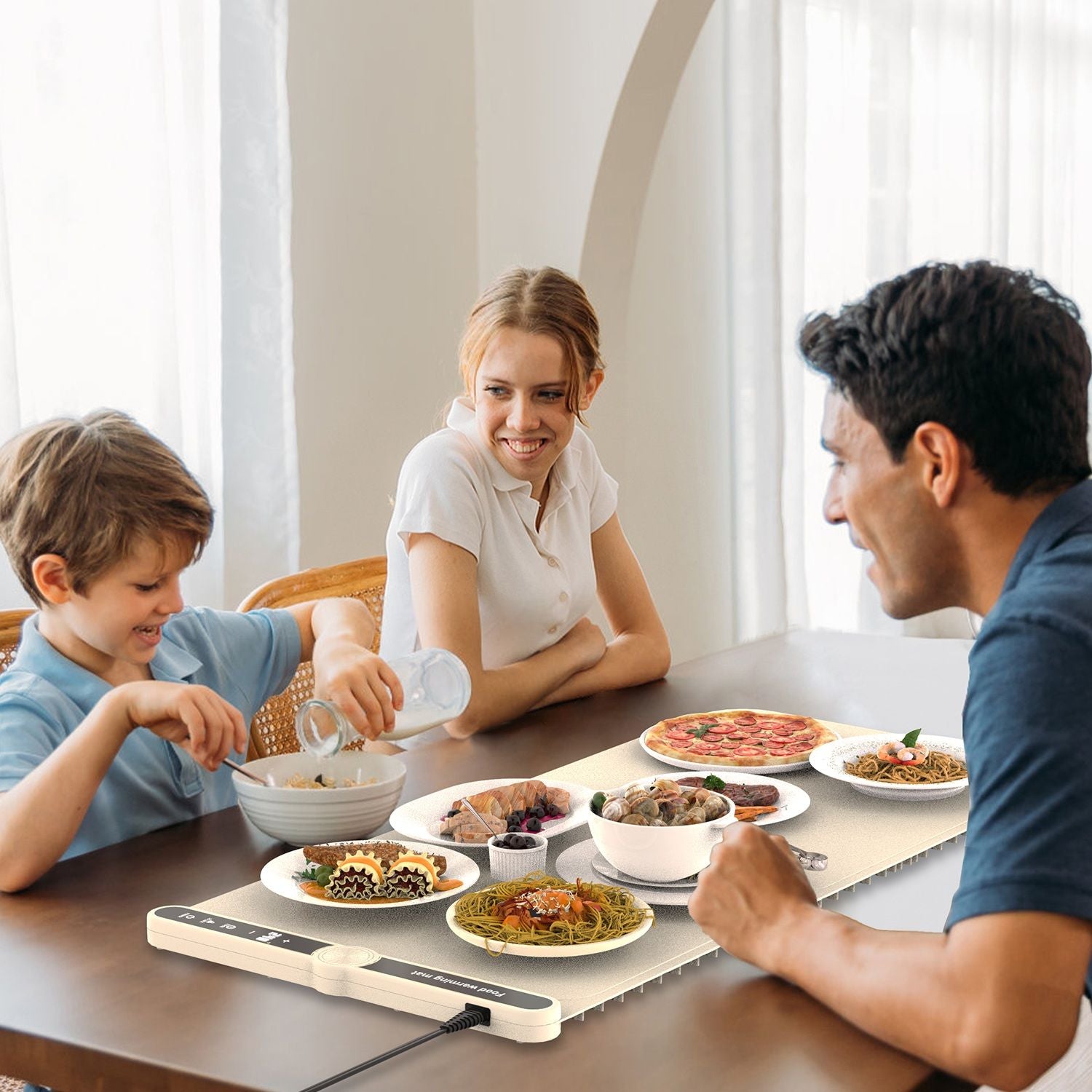 *8S Fast & Enlarge Heating Area*:Adopts 330W advanced heating wires which cover the entire bottom,our food warming mat ensures quick and comprehensive heating distribution in 8seconds. Offering M size for 6plates and L size for 8plates,enlarge heating area making it perfectly suitable for dishes of all sizes. Keep your food warm and delicious when family gatherings,festive celebrations,social dining,parties,buffets,travel.